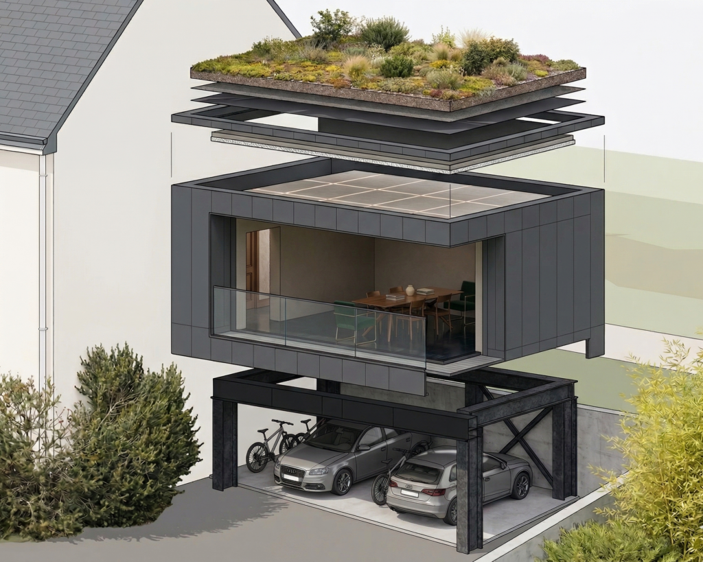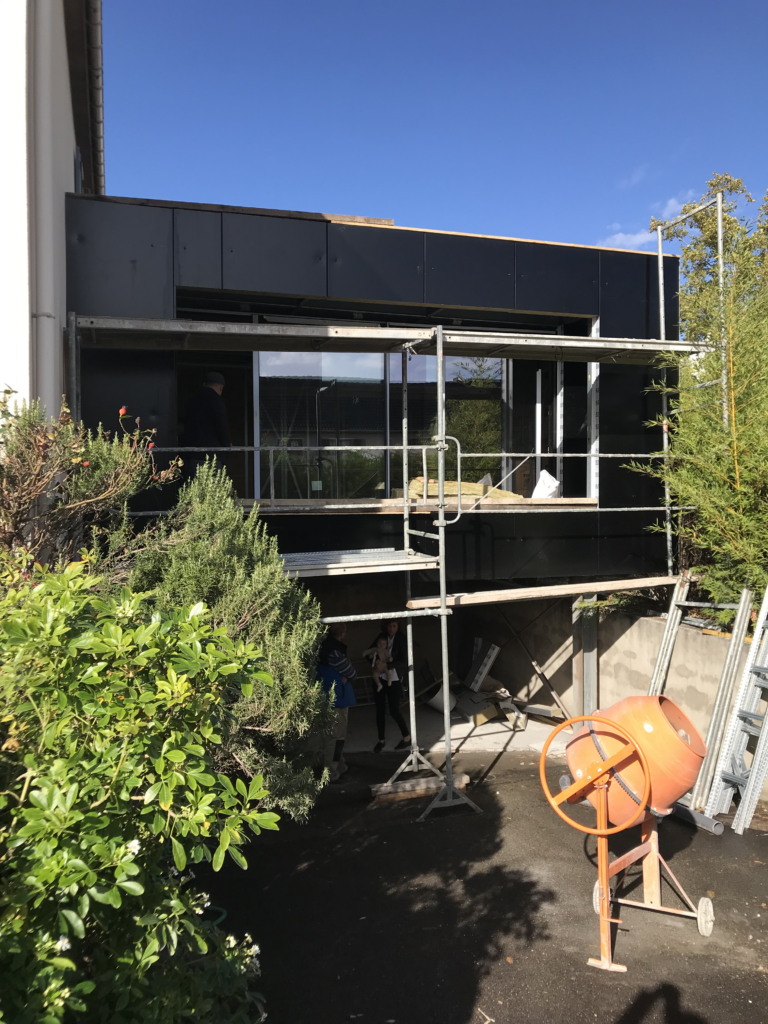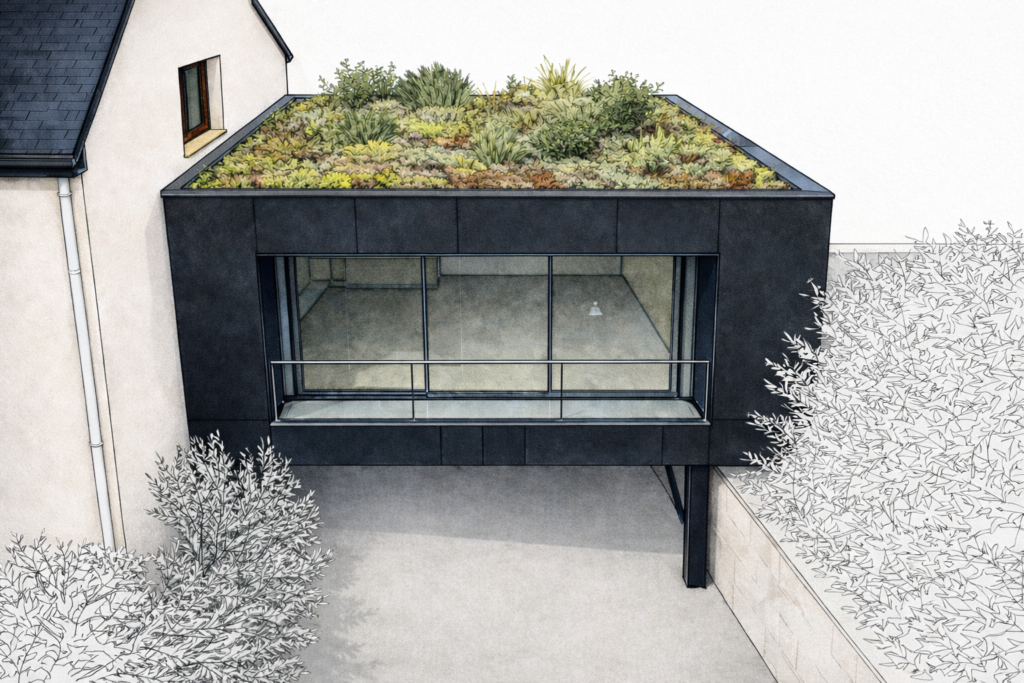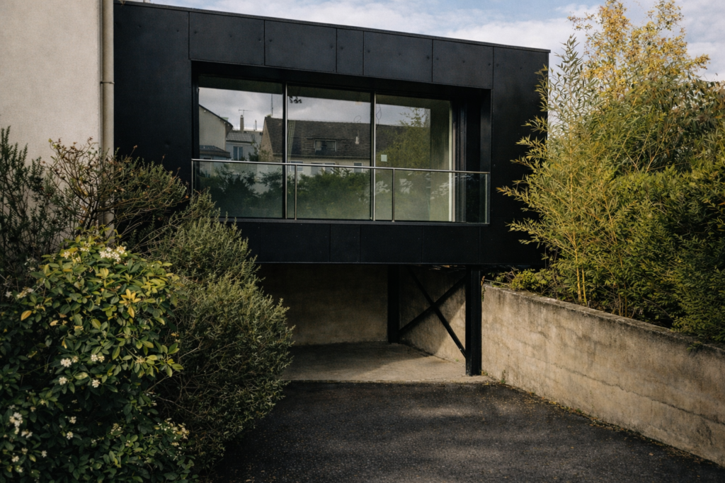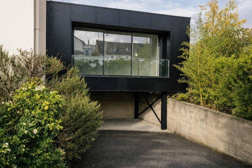 Cette extension vient prolonger la maison existante avec une écriture sobre et précise : un volume compact, habillé de métal noir, qui capte la lumière et cadre les vues.