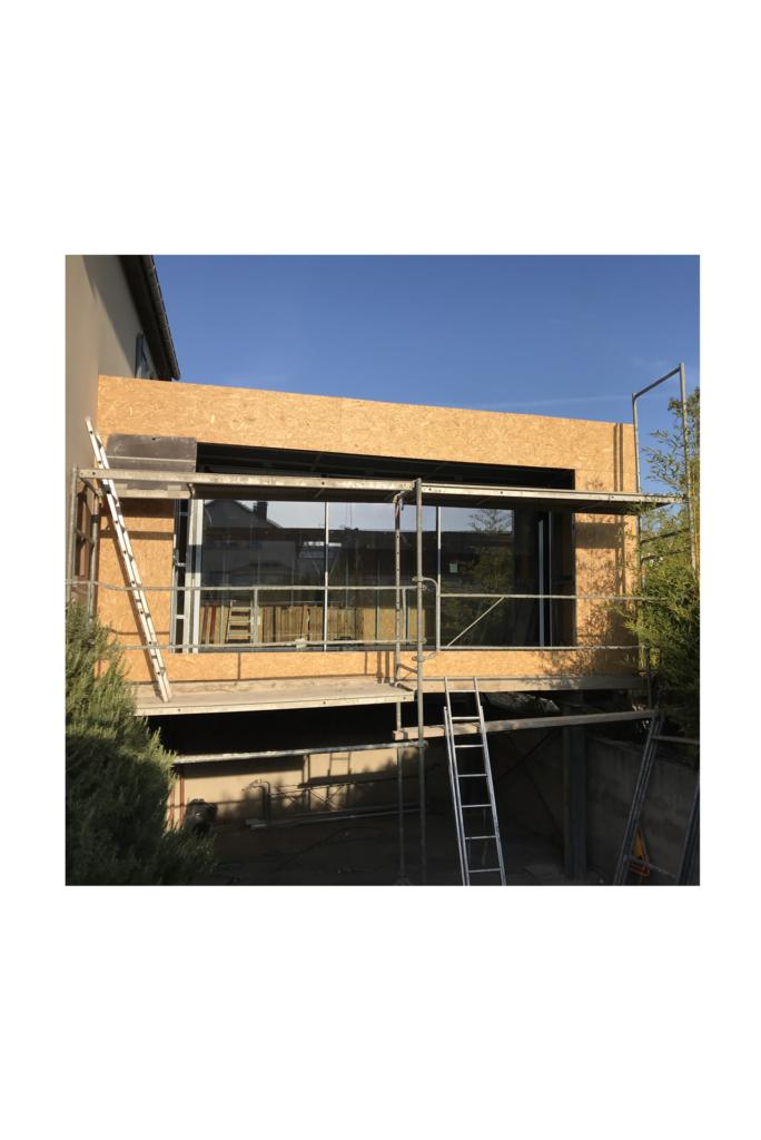 Terre et Bois Noir – livré en 2025 – extension sur jardin – pisé et bois brulé