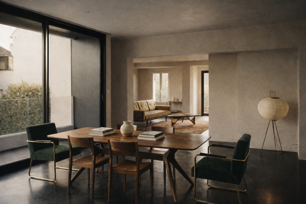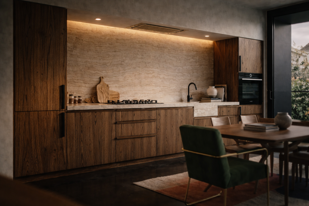 À l’intérieur, les matières répondent à cette rigueur — bois chaud, pierre texturée, tonalités profondes — pour créer un espace à la fois enveloppant et ouvert.